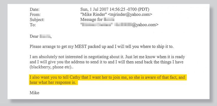 After abandoning his family and the Church, Rinder hid out first in Florida, then in Virginia. Three weeks later he emailed a Church staff member to arrange for his possessions to be shipped to him. Before signing off, he noted: “I also want you to tell Cathy that I want her to join me, so she is aware of that fact, and hear what her response is.”